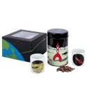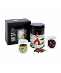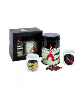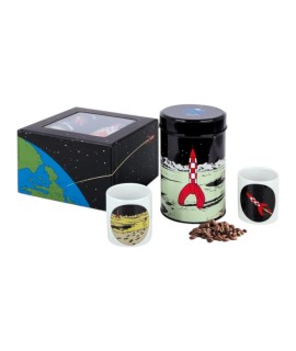 Este elegante cofre/regalo incluye una lata ilustrada con el cohete de Tintín en la luna, llena de 220 gr. De café d'Or de Rombouts, ecológico y en grano y 2 tazas de café expresso ilustradas con motivos a juego.